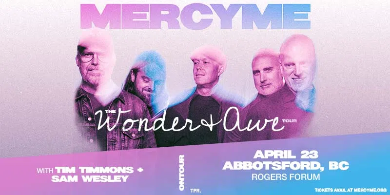 Bringing their signature blend of powerful worship and chart-topping hits to the stage once again, multi-platinum band MercyMe will launch the Wonder + Awe Tour this spring, named after their latest album. Joined by beloved group Big Daddy Weave, longtime friend Tim Timmons, and newcomer Sam Wesley, the 24-city trek promises unforgettable nights of music, hope, and community. Fans can expect to hear MercyMe’s biggest songs alongside new favorites from Wonder + Awe, making each evening a time to celebrate God’s goodness together. MercyMe will be performing at Rogers Arena in Abbotsford, BC on Thursday, April 23rd, 2026.